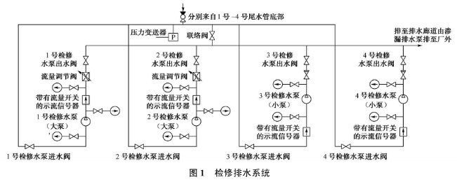 桐柏電站的檢修排水系統(tǒng),共設4臺排水泵,如圖1所示,1號、2號檢修水泵(大泵)用于排空引水隧洞、蝸殼、尾水管、尾水隧洞內的水;3號、4號檢修水泵(小泵)用于球閥、上下庫閘門等的滲漏排水。每臺檢修水泵均配置逆止閥、壓力表和帶流量開關的示流信號器,在1號、2號水泵出水管處各安裝了一個流量調節(jié)閥。系統(tǒng)中共有2根總管,一根為水泵的總吸水管,包括從每臺機組尾水管底部至總管的支管,總吸水管和部分支管及管路上的操作閥門布置在廠房管路廊道中;另一根為總排水管,可將水排至滲漏集水井中,再經(jīng)滲漏排水泵排至下庫。