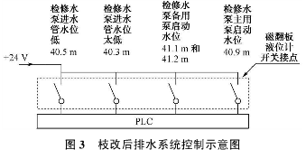 它結構是利用旁通管的原理,主導管內的液位和尾水管內的液位高度一致,根據(jù)阿基米德定理,磁性浮子在液體中產(chǎn)生的浮力和重力平衡,當尾水管中的水位升降時,液位計主導管內的浮子也隨之升降,浮子內的永久磁鐵通過磁耦合驅動指示器內的翻板指示器,當液位上升或下降時,翻板指示器由白色翻轉為紅色,或由原來的紅色翻轉為白色,指示器的顏色改變的高度就是被測水位的實際高度,從而實現(xiàn)液位的現(xiàn)場指示,以供運行人員目測尾水管的實時水位。安裝于液位計管壁外側的磁記憶開關,可多點設置、滑動調整位置,提供了液位開關量報警功能。在裝置的頂部安裝了一個自動排氣裝置,當主導管內液位上升時能夠自動的排氣,下降時能夠按時補氣?,F(xiàn)場安裝頂裝式磁翻板液位計時,裝置標尺的0位,對應的實地高程為EL.40.0m。浮子開關設定5個水位動作值,檢修水位低開關量報警值對應的高程為40.3m;停止所有檢修水泵的開關量,所對應的高程為40.5m;啟動主用檢修水泵的開關量,所對應的高程為40.9m;啟動檢修水泵主用泵的開關量,以及要求手動啟動大泵,并作為水位高報警上送上位機,所對應的高程為41.1m與41.2m,兩個開關量并列接入。全部開關量分別送入PLC,如圖3所示。