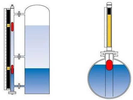 在桶槽外側(cè)裝置延伸旁路管,由旁路管外加裝液位指示器,將裝有磁鐵的浮球放進(jìn)旁路管內(nèi),因磁性色片內(nèi)裝著與浮球磁性相反之磁鐵,所以當(dāng)浮球上升時(shí)會吸引磁性色片翻動(dòng),磁性色片顏色會由白色翻為紅色(或銀色翻為金色),以指示實(shí)際液面高度。