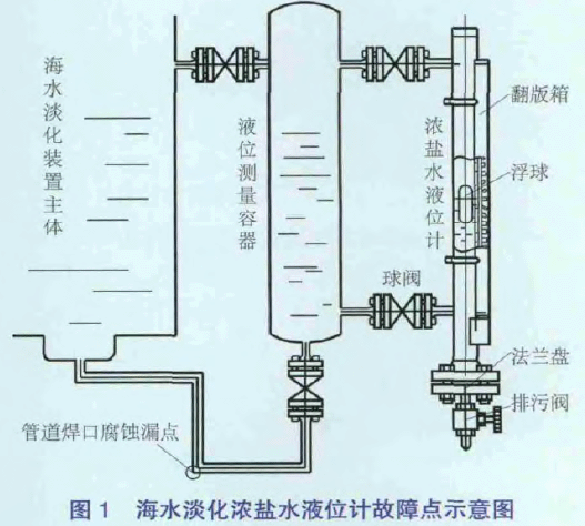 *鋼京唐鋼鐵公司帶熱壓縮器低溫多效蒸餾海水淡化的濃鹽水、蒸餾水及冷凝水液位測量都采用帶遠傳的防腐磁翻板液位計。為了防止結(jié)垢,需在低溫的情況下讓海水達到沸點,要求海水淡化裝置內(nèi)部處于負壓狀態(tài),正常運行時為-0.093MPa左右?,F(xiàn)將磁翻板液位計在負壓狀態(tài)下發(fā)生管路漏氣的典型故障進行分析。