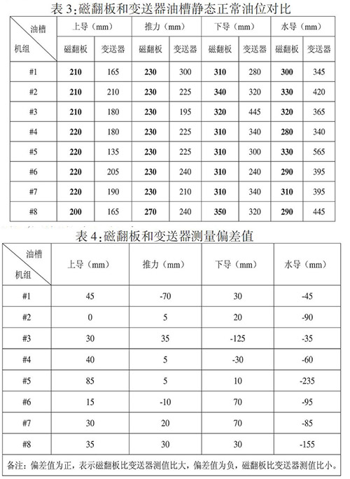 3)通過表3、表4,可以看出磁翻板耐酸堿磁翻板液位計廠家油位和變送器油位測值存在偏差,導(dǎo)致變送器油位測值不能直接反映油槽實際油位的高低,需要結(jié)合磁翻板和變送器的偏差值才能得出油槽實際油位,故建議下個檢修期時重新修正油位變送器的量程,使靜態(tài)下變送器油位測值與磁翻板油位保持一致,運行時能夠直接反映油槽實際油位的高低;