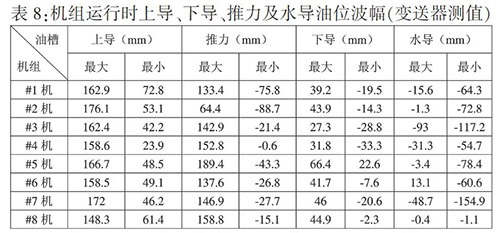 從表8可以看出,上導(dǎo)波幅均在靜態(tài)油位以上,容易出現(xiàn)高油位報警;推力和下導(dǎo)油槽油槽波幅均上下跨越靜態(tài)油位,容易出現(xiàn)高油位、低油位報警;水導(dǎo)油槽波幅在靜態(tài)油位以下,容易出現(xiàn)低油位報警。