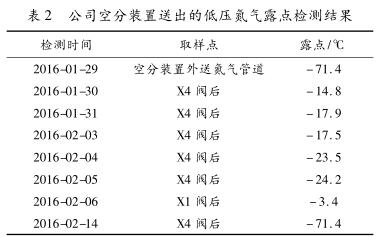 2016年2月14日在X4閥處檢測(cè)氮?dú)獾穆饵c(diǎn)為-71.4℃,與空分裝置外送氮?dú)獾穆饵c(diǎn)一樣,表明低壓氮?dú)夤芫W(wǎng)中的水已經(jīng)完全排出。