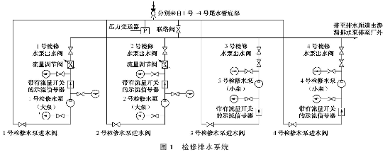 每臺檢修水泵均配置逆止閥、壓力表和帶流量開關(guān)的示流信號器,在1號、2號水泵出水管處各安裝了一個(gè)流量調(diào)節(jié)閥。系統(tǒng)中共有2根總管,一根為水泵的總吸水管,包括從每臺機(jī)組尾水管底部至總管的支管,總吸水管和部分支管及管路上的操作閥門布置在廠房管路廊道中;另一根為總排水管,可將水排至滲漏集水井中,再經(jīng)滲漏排水泵排至下庫。