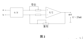來自液位傳感器的對應液位高度的電阻信號,進入圖2所示的a,b端,經(jīng)處理后*終輸出4~20mA DC標準信號。