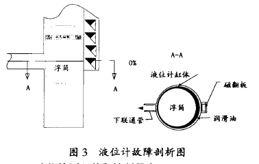 持續(xù)向空貯罐加油至液位計指示值37%時,用時約15min。反之,排油液位計回零用時大于40min。在其它區(qū)域液位變化則快許多。通過對氯酸液位計結(jié)構(gòu)分析,我們發(fā)現(xiàn):圓柱體浮筒(~58mm×280mm)浮在0% ~37%區(qū)間時,形同一個柱塞擋住了液位計簡體下部的聯(lián)通管管口(見圖3,