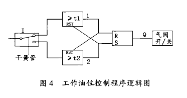 液位計筒體內(nèi)徑d/~i0mm,標(biāo)尺長750mm。750mm×20%=150mm,280÷750=37.3%),液位計油位滯后于貯罐油位變化。液位計回油時,浮筒漂向管口,則阻尼作用更強(qiáng)了,低油位*限開關(guān)LB/LVL6不能及時動作和關(guān)閉氣閥LB/EV2是造成貯油罐泄空而計算機(jī)未執(zhí)行油位故障處理程序的原因。圖3 液位計故障剖析圖3.2 液位檢測開關(guān)和控制程序干簧管式接近開關(guān)本身依靠磁控開或合,易受周圍磁場干擾產(chǎn)生誤動。現(xiàn)場液位計安裝位置一側(cè)與電纜橋架相鄰,而另一側(cè)常有行車電磁吸盤吊裝鋼卷作業(yè)。從工作油位控制邏輯過程可以看出(圖4):盡管油位檢測開關(guān)已通,每15s(t1=t2=15s)內(nèi),只要存在一次脈沖干擾,開氣閥電路回路將未被選通。反之亦然。因此,干簧管式接近開關(guān)誤動產(chǎn)生錯誤控制,也是釀成事故的另一個原因。