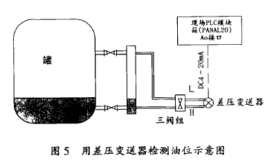 用差壓法檢測油位(△P=p•h)。在上、下聯(lián)通管處開孔取壓,選用智能差壓變送器(*大測量范圍0~10kPa,耐壓力1.6 a,輸出DC 4~20mA,帶顯示表)檢測差壓。標(biāo)定時,取工作用油壓力0~750ram油柱(為保證p值不變)作為輸入,并使表頭指示為0%~100%(線性關(guān)系)即可。差壓變送器輸出信號接入現(xiàn)場PLC模塊箱PANAL20的模擬量輸入通道,與軋線計算機(jī)聯(lián)網(wǎng)(見圖5)。