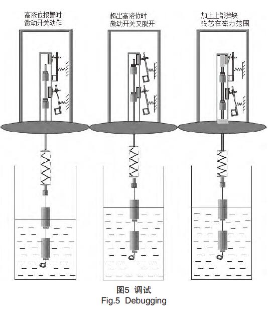 3)在調(diào)試過程中,發(fā)現(xiàn)液位開關(guān)沒有自保持功能,當高報警點過后,液位再往上升則高液位報警會消除,低液位時也是同樣,在分析原因后發(fā)現(xiàn),鐵芯在套筒內(nèi)移動的位置不當是造成不能自保持的原因,如圖5所示,于是在套筒內(nèi)的鐵芯上方加一阻擋塊,使高液位超出時,鐵芯被阻擋塊擋住,不再向上移動,從而不會脫出微動開關(guān)的磁力范圍,對低液位報警的自保持是在鐵芯的下部加一個環(huán)型的墊片,阻止鐵芯向下移動超出微動開關(guān)的磁力范圍。從而提高了可靠性和重復性。接下來的調(diào)試中,又出現(xiàn)了一些零零碎碎的問題,如磁鐵磁性不夠,或者彈簧彈性不夠,彈簧的抗疲勞性差。元器件的材料和加工工藝不理想,出于對核電的安全性和穩(wěn)定性的考慮,開始考慮使用國外公司的產(chǎn)品,在試用后沒有出現(xiàn)以上的問題,于是決定從新采購一批國外的液位開關(guān),將有問題的液位開關(guān)更換成國外的產(chǎn)品。