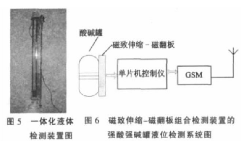 目前,工業(yè)用濃酸、濃堿液罐內(nèi)的液位檢測手段,主要有超聲波液位檢測儀、磁翻板液位計(jì)、接觸式防腐蝕液位檢測裝置等。2007年05月,作者參觀了山西省陽城電廠,對(duì)陽城電廠的酸堿罐液位檢測裝置進(jìn)行了考察;該廠現(xiàn)有大小20余個(gè)酸堿罐中酸堿液位的檢測,大都采用超聲波液位計(jì)與磁翻板液位計(jì)相結(jié)合的方式。超聲波液位計(jì)對(duì)酸堿液位信息通過線路傳輸?shù)接?jì)算機(jī),進(jìn)行實(shí)時(shí)觀測。但據(jù)該廠技術(shù)人員介紹,超聲波液位計(jì)有一個(gè)致命缺點(diǎn),就是安裝在罐頂部的超聲波探頭很容易被酸霧或堿霧籠罩,嚴(yán)重影響了測量準(zhǔn)確度,需要工作人員定時(shí)對(duì)超聲波探頭進(jìn)行清洗。磁翻板液位計(jì)沒有數(shù)據(jù)的自動(dòng)傳輸功能,需要工作人員定時(shí)地去觀察液位刻度。為了確保酸堿液位數(shù)據(jù)的可靠性,該廠技術(shù)人員提出增加一套液位檢測裝置的要求,并能實(shí)現(xiàn)數(shù)據(jù)的自動(dòng)化遠(yuǎn)程傳輸。為此,作者利用磁致伸縮傳感器和磁翻板相結(jié)合的辦法,以求實(shí)現(xiàn)酸堿液位的非接觸式測量,并利用單片機(jī)和GSM技術(shù),實(shí)現(xiàn)磁致伸縮液位信號(hào)的無線傳輸。