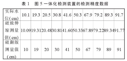 我們把圖5所示的一體化檢測裝置進(jìn)行了水位檢測實(shí)驗(yàn),其檢測結(jié)果與實(shí)際水位值見表1。