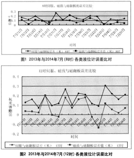 由以上兩圖得知,伺服液位計誤差值曲線較高,液位漲浮較大,計量誤差*髙達(dá)+0.3m,而磁致液位計誤差值曲線相對穩(wěn)定,液位漲浮較小,計量誤差在±0.2m之間,較為精準(zhǔn)。