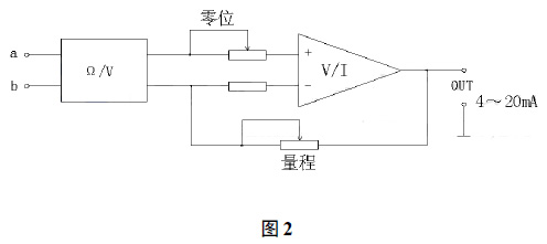 來自液位傳感器的對應(yīng)液位高度的電阻信號,進(jìn)入圖2所示的a,b端,經(jīng)處理后*終輸出4~20mA DC標(biāo)準(zhǔn)信號。