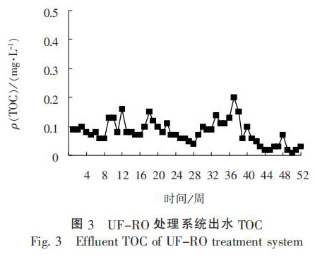 經(jīng)過(guò) 1 年的連續(xù)運(yùn)行, 晶背研磨廢水進(jìn)水 TOC質(zhì)量濃度為 0.5 ~ 5.0 mg / L, 濁度為 80 ~ 100 NTU,SiO2 質(zhì) 量 濃 度 為 2 ~ 4 mg / L, 反 洗 廢 水 進(jìn) 水 TOC質(zhì) 量 濃 度 為 1.5 ~ 3.0 mg / L, 濁 度 為 4 ~ 8 NTU,UF-RO 處理出水 TOC 質(zhì)量濃度低于 1 mg / L, 濁度低于 0.1 mg / L, SiO2 質(zhì) 量 濃 度 低 于 1 mg / L, 完 全可以回用至超純水預(yù)處理系統(tǒng)。 UF-RO 處理系統(tǒng)出水電導(dǎo)率和 TOC 濃度見(jiàn)圖 2 ~ 圖 3。