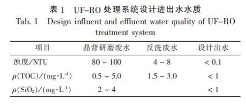 國(guó)內(nèi)某鹽酸罐液位計(jì)廠, 晶背研磨廢水產(chǎn)生量為 150 ~160 m3 / d, 反洗廢水產(chǎn)生量 為 500 ~ 700 m3 / d, 主要污染物為懸浮物, UF-RO 處理系統(tǒng)設(shè)計(jì)進(jìn)水和出水主要水質(zhì)指標(biāo)見(jiàn)表 1。