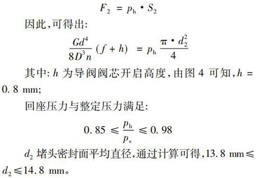 其 中: G 為彈簧材料切變模量,彈 簧 材 料 為60Si2MnA,G = 78. 5*103 MPa; d 為彈簧材料直徑, d = 4 mm; D 為彈簧中徑,D = 25 mm; n 彈簧有效圈數(shù),n = 6; ps 為整定壓力,ps = 1. 6 MPa; d1 為導閥密封面直徑,根據(jù)設計圖樣,d1 = 13 mm; f 為導閥彈簧初始變形量,通過計算可得,f = 7. 9 mm。