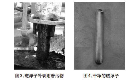 經(jīng)過(guò)兩年多運(yùn)行,污水罐內(nèi)可能沉淀污泥雜質(zhì)導(dǎo)致液位計(jì)示數(shù)不準(zhǔn)?,F(xiàn)場(chǎng)拆卸液位計(jì),并且對(duì)浮球和磁浮子進(jìn)行清洗。(圖3-圖4)