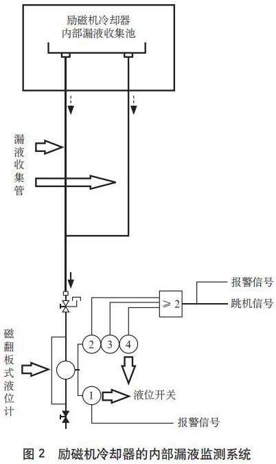 實(shí)際運(yùn)行經(jīng)驗(yàn)表明,防凍液位計(jì)內(nèi)部銅管發(fā)生泄漏的概率較低,但一旦發(fā)生泄漏,漏液會(huì)隨著冷卻空氣沿閉合風(fēng)路進(jìn)入勵(lì)磁機(jī)內(nèi)部,造成勵(lì)磁機(jī)短路損壞的嚴(yán)重后果。為了保證機(jī)組安全,應(yīng)有冷卻器內(nèi)部銅管泄漏監(jiān)測(cè)裝置,然而現(xiàn)場(chǎng)沒(méi)有配置此類(lèi)裝置。