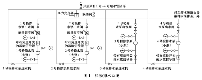桐柏電站的檢修排水系統(tǒng),共設(shè)4臺排水泵,如圖1所示,1號、2號檢修水泵(大泵)用于排空引水隧洞、蝸殼、尾水管、尾水隧洞內(nèi)的水;3號、4號檢修水泵(小泵)用于球閥、上下庫閘門等的滲漏排水。每臺檢修水泵均配置逆止閥、壓力表和帶流量開關(guān)的示流信號器,在1號、2號水泵出水管處各安裝了一個流量調(diào)節(jié)閥。系統(tǒng)中共有2根總管,一根為水泵的總吸水管,包括從每臺機(jī)組尾水管底部至總管的支管,總吸水管和部分支管及管路上的操作閥門布置在廠房管路廊道中;另一根為總排水管,可將水排至滲漏集水井中,再經(jīng)滲漏排水泵排至下庫。