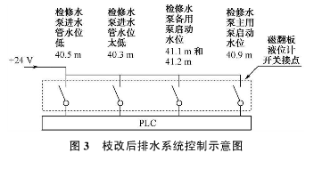 它結(jié)構(gòu)是利用旁通管的原理,主導(dǎo)管內(nèi)的液位和尾水管內(nèi)的液位高度一致,根據(jù)阿基米德定理,磁性浮子在液體中產(chǎn)生的浮力和重力平衡,當(dāng)尾水管中的水位升降時,液位計主導(dǎo)管內(nèi)的浮子也隨之升降,浮子內(nèi)的永久磁鐵通過磁耦合驅(qū)動指示器內(nèi)的翻板指示器,當(dāng)液位上升或下降時,翻板指示器由白色翻轉(zhuǎn)為紅色,或由原來的紅色翻轉(zhuǎn)為白色,指示器的顏色改變的高度就是被測水位的實(shí)際高度,從而實(shí)現(xiàn)液位的現(xiàn)場指示,以供運(yùn)行人員目測尾水管的實(shí)時水位。安裝于液位計管壁外側(cè)的磁記憶開關(guān),可多點(diǎn)設(shè)置、滑動調(diào)整位置,提供了液位開關(guān)量報警功能。在裝置的頂部安裝了一個自動排氣裝置,當(dāng)主導(dǎo)管內(nèi)液位上升時能夠自動的排氣,下降時能夠按時補(bǔ)氣?,F(xiàn)場安裝耐高溫磁翻板液位計時,裝置標(biāo)尺的0位,對應(yīng)的實(shí)地高程為EL.40.0m。浮子開關(guān)設(shè)定5個水位動作值,檢修水位低開關(guān)量報警值對應(yīng)的高程為40.3m;停止所有檢修水泵的開關(guān)量,所對應(yīng)的高程為40.5m;啟動主用檢修水泵的開關(guān)量,所對應(yīng)的高程為40.9m;啟動檢修水泵主用泵的開關(guān)量,以及要求手動啟動大泵,并作為水位高報警上送上位機(jī),所對應(yīng)的高程為41.1m與41.2m,兩個開關(guān)量并列接入。全部開關(guān)量分別送入PLC,如圖3所示。