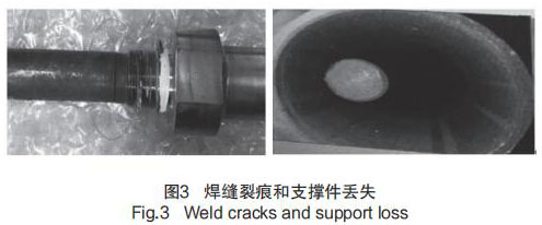 在歷次大修執(zhí)行 GSS 系統(tǒng) MSR 食用油液位計預(yù)防性維修檢查時發(fā)現(xiàn),部分導(dǎo)波桿支撐件破碎并丟失,同時存在探桿根部焊縫有裂痕的問題,見圖 3 焊縫裂痕和支撐件丟失。