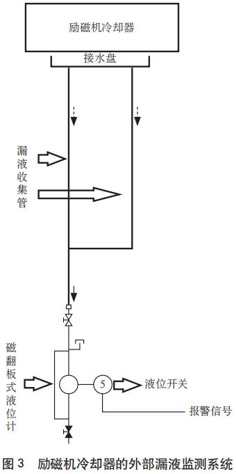 實際運行經(jīng)驗表明,側(cè)裝式磁翻板液位計內(nèi)部銅管發(fā)生泄漏的概率較低,但一旦發(fā)生泄漏,漏液會隨著冷卻空氣沿閉合風(fēng)路進入勵磁機內(nèi)部,造成勵磁機短路損壞的嚴重后果。為了保證機組安全,應(yīng)有冷卻器內(nèi)部銅管泄漏監(jiān)測裝置,然而現(xiàn)場沒有配置此類裝置。