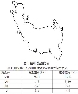 在該水庫(kù)工程當(dāng)中,測(cè)量人員采用的坐標(biāo)系統(tǒng)是1980西安坐標(biāo)系。在具體的測(cè)量過(guò)程之中,測(cè)量人員運(yùn)用2臺(tái)南方GPS儀器來(lái)收集相應(yīng)的測(cè)量數(shù)據(jù),并使用1臺(tái)徠卡全站儀、一臺(tái)GPS-RTK來(lái)完成相應(yīng)的數(shù)據(jù)采集工作。對(duì)水庫(kù)進(jìn)行勘測(cè)定界的主要目的是針對(duì)淹沒(méi)線作用的土地范圍,對(duì)界樁實(shí)施測(cè)量與放樣,結(jié)合設(shè)計(jì)水位的高程,做好界樁拔放工作。因?yàn)樵摰貐^(qū)的地形比較陡峭,故測(cè)量人員決定采用雙基站方法開(kāi)展測(cè)量工作。該地區(qū)共有5個(gè)控制點(diǎn),具體的位置分布見(jiàn)圖1。另外,因?yàn)镽TK數(shù)據(jù)鏈?zhǔn)褂贸哳l電磁波,數(shù)據(jù)鏈所發(fā)生的電磁波頻率比較高,能夠得到456MHz,為了保證測(cè)量數(shù)據(jù)更為精確,測(cè)量人員可以將基準(zhǔn)站設(shè)置在測(cè)區(qū)的zui高位置,并結(jié)合RTK作用距離和基準(zhǔn)站架設(shè)高度之間的關(guān)系,合理控制基準(zhǔn)站的架設(shè)高度,RTK作用距離和基準(zhǔn)站架設(shè)高度之間的關(guān)系見(jiàn)表1。