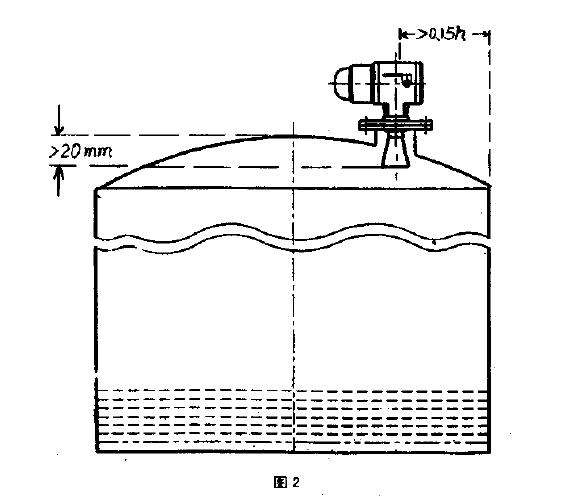 ①喇叭口天線的下端必須低于罐頂20mm以上,法蘭對(duì)水平面的誤差應(yīng)小于±0.5°,喇叭天線的中軸線應(yīng)保證與液面垂直,且距罐壁的*小安裝距離不能小于0.15H ( H為罐高)。(如圖2)
