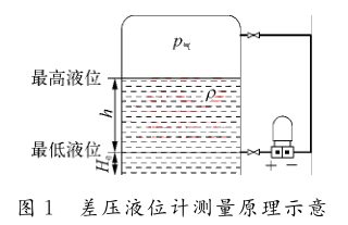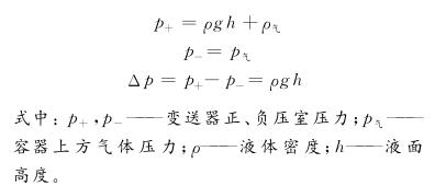 在粉煤加壓氣化工藝流程中,冷卻水、冷凝水是干凈潔凈的介質(zhì),測量該介質(zhì)的液位如無特殊情況,選用普通的差壓式液位計即可。差壓式液位計是利用流體靜力學(xué)原理,通過測量流體的壓差來計算出液位的高低,其測量原理如圖1所示。這種方法簡捷、方便,但是準確度與穩(wěn)定性不高,而且測量結(jié)果受到介質(zhì)密度的影響,為滿足測量精度常需要進行補償或采用組合式儀表測量方案。