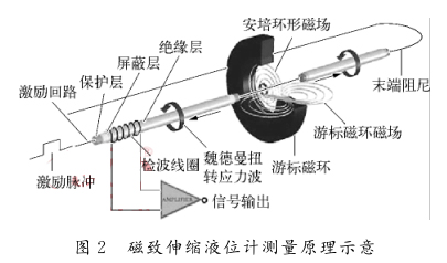 這樣的選型設(shè)計,雖然能夠滿足測量準確度的要求,但相應(yīng)增加了購置成本,并且根據(jù)項目應(yīng)用的實際反饋,現(xiàn)場存在泄漏點多、安裝與維護較復(fù)雜等問題。因此在新的伊泰杭錦旗項目中,由于項目所在地的晝夜溫差較大,冬季環(huán)境溫度*低,改用側(cè)裝3臺磁致伸縮式液位計并配磁翻柱顯示器來替代原先的差壓式測量方案。磁致伸縮式液位計主要依據(jù)磁致伸縮原理而工作,工作原理如圖2所示,由傳感器電路沿磁致伸縮線(波導(dǎo)絲)發(fā)出電流脈沖,在磁致伸縮線周圍形成環(huán)形磁場,當(dāng)其與浮子內(nèi)的永磁鐵產(chǎn)生的縱向磁場發(fā)生疊加時,會在浮子位置產(chǎn)生1個扭轉(zhuǎn)脈沖回傳至傳感器的探頭。測量起始脈沖與返回脈沖的時間差來確定浮子的位置,即液面的位置。磁致伸縮液位計具有精度高、使用壽命長、無需調(diào)零校準、易維護、安全性高等優(yōu)點,但是在安裝時要注意:探測桿要保證垂直,不能折彎;做好接地屏蔽工作,以免電磁干擾影響測量效果。