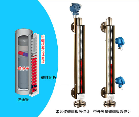 冷凝水液位計(jì)主要利用了浮力和磁性偶合來完成指示過程。當(dāng)液位上升時,浮球在浮力作用下由下往上運(yùn)動,翻柱受到浮球中磁感應(yīng)力的作用翻轉(zhuǎn)180°,顏色由白色變?yōu)榧t色,面板上紅白翻柱的分界位置即為罐體中實(shí)際液位高度(如圖1),當(dāng)液位下降時浮球由上往下運(yùn)動,帶動翻柱翻轉(zhuǎn),顏色由紅色變?yōu)榘咨?br />