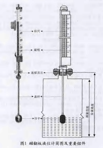 側裝磁翻板液位計是根據(jù)國內(nèi)外同類產(chǎn)品加以消化提高且按照原化工部頒布的磁浮子液位計標準HG/T21584-95研制生產(chǎn)的產(chǎn)品。按照其安裝位置,側裝磁翻板液位計可以分為頂裝型和側裝型兩類。目前,托甫臺區(qū)塊密閉流程采用的是無護管頂裝型液位計(U11Z221/D-2400),23口單井密閉流程中共一計使用87個。側裝磁翻板液位計主要利用阿基米德浮力原理和磁耦合原理設計而成,它的主要組成部分包括磁浮子、連桿、磁性頭、磁柱以及面板標尺等(圖1),磁柱正反兩面分別為紅色和白色,主要用于指示液面位置。液位計正常工作時,磁浮子一半體積浸沒在液體中,呈漂浮狀態(tài),并且隨著液面的升降而同時升降。當液面上升時,磁浮子帶動連桿上的磁性頭向上運動,磁性頭與面板內(nèi)的磁柱發(fā)生物理反應,產(chǎn)生扭矩,促使磁柱發(fā)生180°的翻轉,即由白色轉變?yōu)榧t色;當液面下降時,根據(jù)相同的原理,磁柱由紅色翻轉為白色。因此,顯示面板上磁柱紅色和白色的分界線就指示了容器內(nèi)待測液體的液面位置。
