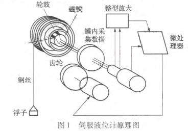 伺服液位計具有智能性、高精度等優(yōu)點。從前文的分類角度而言,伺服液位計屬于接觸式、力學(xué)原理類的智能液位計。它的工作原理是基于浮力平衡原理,由微型伺服電機連接細鋼絲驅(qū)動體積較小的浮子,形成一個閉環(huán)反饋系統(tǒng),如圖1所示。當(dāng)液位計工作時,浮子自身產(chǎn)生的重力作用于細鋼絲上,在外輪鼓產(chǎn)生力矩,從而引起磁通量的變化,磁通量的變化將導(dǎo)致電磁傳感器的輸出電壓信號發(fā)生變化。將電壓值與存儲于CPU中的參考電壓進行比較,當(dāng)達到浮力平衡時,電壓差值為零。此時測量纏繞在輪鼓上細鋼絲所經(jīng)歷的長度變化,得出液位變化情況,由于輪鼓對鋼絲的測量分辨率很小,從而使得伺服液位計能夠達到±1mm左右的精確度。