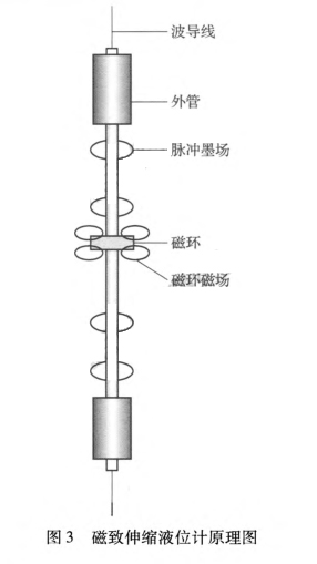 磁致伸縮液位計是根據(jù)磁致伸縮原理進行工作的液位計,具體工作原理:在非磁性的波導(dǎo)管內(nèi)安裝一根磁致波導(dǎo)線,波導(dǎo)管外部安裝有隨液面進行上下運動的磁性浮子,在磁致波導(dǎo)線的其中一端裝有壓磁傳感器,傳感器在每個時間單位發(fā)出一定數(shù)量的電流脈沖信號,此信號沿著磁致波導(dǎo)線向下傳送,從而產(chǎn)生一個向下運動的磁環(huán)磁場,該磁環(huán)磁場同磁性浮子的磁場相互作用,從而產(chǎn)生一個脈沖磁場,脈沖以已知速度沿磁致波導(dǎo)線運動,并被壓磁傳感器接收,通過計算起始電流脈沖和返回脈沖的時間間隔得出浮子的位置,如圖3所示。